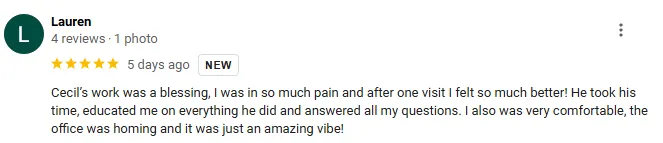 Great experience! I have been back several times. Does a great job of explaining how your body is healing and recovering. I was in a car accident and this place has been great for my needs. He also does pediatric care!